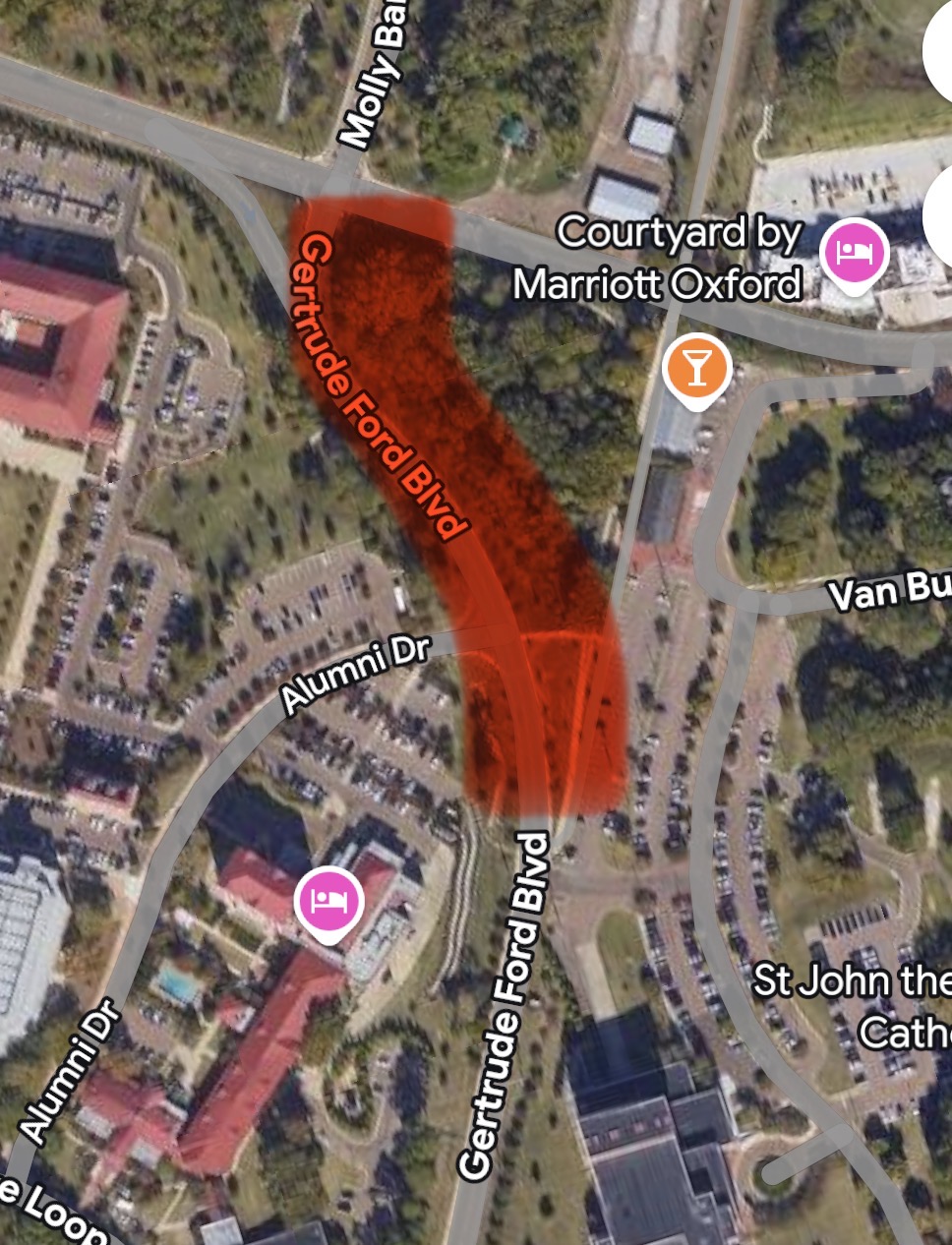 City of Oxford and University of Mississippi debris contractors will be clearing the area along Gertrude Ford between Alumni Drive and West Jackson Avenue tomorrow, March 11. Large equipment being used to pick up the debris will necessitate the northbound lane through this area being shut down. Traffic will be detoured through the Gertrude Ford Center parking lot to Depot Street for access to West Jackson during this time.